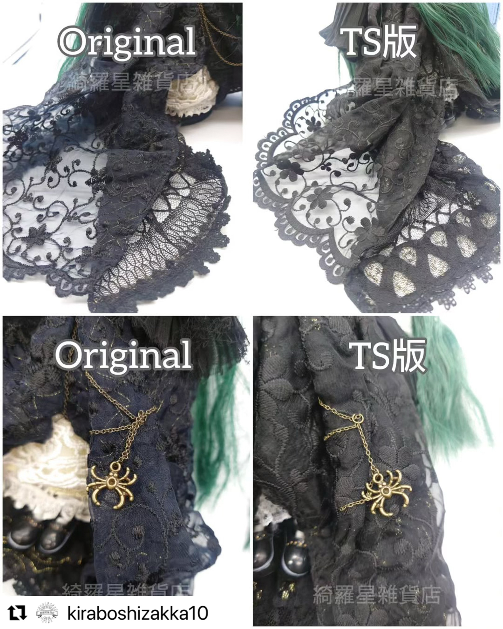 There are changes to the lace fabric here as well. The original used a bluish tulle, whereas the TS version is black. The spider charm remains the same shape.